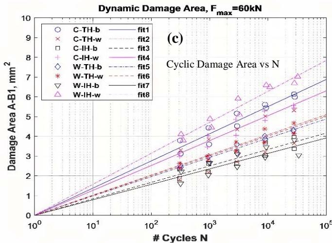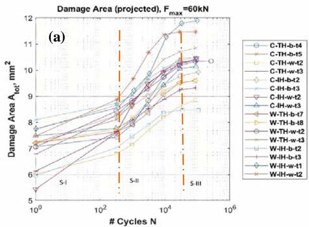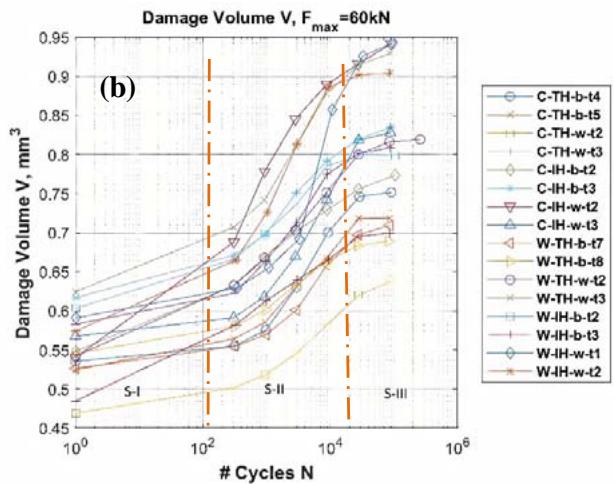Figure 4: (a) Edge projected damage area vs number of cycles, (b) volume of metal vs number of cycles, showing there are three regimes over tested cycle range