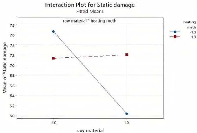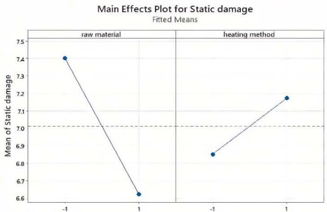 Figure 10 further illustrates the effect of the main factor and 2-way interaction on the static damage. In Figure 10(a), it can be seen that static damage is higher when the raw material process factor is set to the "-" level (C) compared to the "+" level (W). On the other hand, static damage is lower when the heat treatment factor is set to the "-" level (IH) compared to the "+" level (TH), although this effect is not statistically significant. Moreover, Figure 10(b) shows that the combination of raw material process factor C and heat treatment factor IH results in the greatest static damage, while the combination of raw material process factor C and heat treatment factor TH results in the lowest static damage.