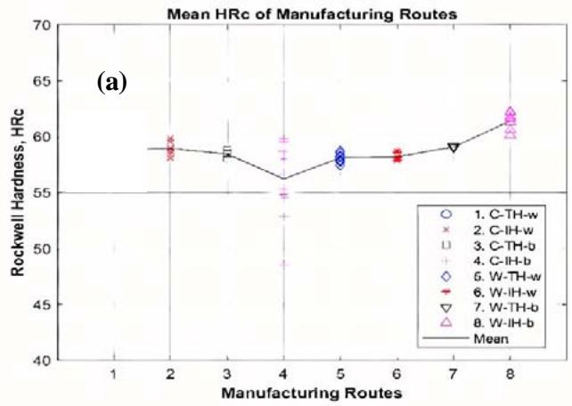 Figure 5: Mean(a) and standard(b) deviation of Rockwell hardness for 8 manufacturing routes. Note that each plotted data point is the mean of 18 measurements (repeats) from one specimen, and about half of these specimens were used for fatigue testing