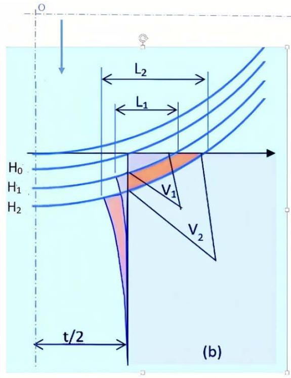 $H_0$ (initial corner contact) to $H_1$ and $H_2$, the pin-corner contact arc length (projected) increases from zero to $L_1$ and $L_2$; the corresponding volume $V_1$ and $V_2$ of the die material is moved from original top surface to side wall, as shown in Figure 3(b), where $t$ is the initial gap between two die cubs. Based on the geometrical relationship, the projected edge damage area can be converted to the corresponding volume of materials. Both of them are used to evaluate the edge damage evolution along with the number of cycles.