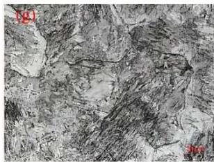 Furthermore, for TH samples, there are at least two tempering processes according to the recommended heating treatment schedule. This results in a reduction of the retained austenite below $5\%$ [33], which means that the TH sample has significantly less retained austenite compared to the IH sample. Austenite is a soft phase in the matrix, which enhances the material's toughness and slows down fatigue damage. As shown in Figure 7(a) and Figure 7(c), for cast bulk materials, the eutectic carbides located at the initial coarse grain boundaries will not dissolve during the austenization process. The grain size of the parent austenite of C-TH-b and C-IH-b is almost the same under low magnification. However, under high magnification, the martensitic morphology and the amount of retained austenite are clearly different, as seen in Figure 7(e) and Figure 7(g). More lath martensite is generated in C-IH, compared to the needle martensite (or plate martensite) in C-TH. It is well-known that the toughness of lath martensite is better than plate martensite. Therefore, for cast materials, IH results in much better fatigue resistance compared to TH. In addition, for wrought bulk materials, Figure 7(b) and Figure 7(d) show that both heat treatment processes can produce a similar microstructure, i.e., small and uniform tempered martensite with retained austenite. Due to the small starting grain size and homogenized chemical composition in unrepaired wrought dies, IH provides sufficient thermal activation for martensite transformation without coarsening the grain size, unlike TH. Figure 7(h) shows the formation of a cryptocrystalline martensite with a super-fine grain size resulting from the subsequent high cooling rate. As a result, W-IH-b achieved the highest scores in both static and cyclic properties, making it the top-ranked process route among the eight studied in Table 1.