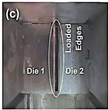 Figure 2: (a) The concept design of simulated trim die edge loading; (b) Self-aligned loading train configuration; (c) Image of specimen damaged edges viewed from fixture opening