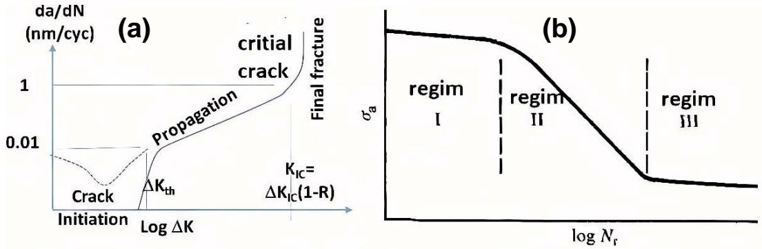 Figure 1: (a) Mechanisms of crack initiation and propagation fatigue failure development; (b) S-N curve showing three regimes of fatigue damage (regenerated schematically based on [21])