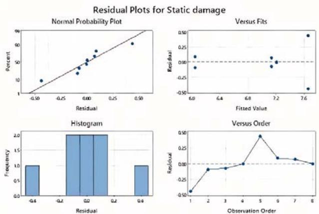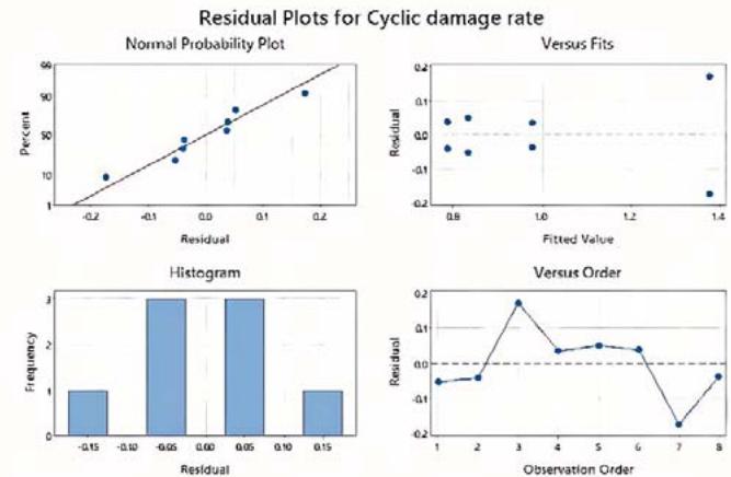 Figure 11 illustrates the impact of the factors on cyclic damage rate, with only the main factor effects plotted since the interaction effect is not statistically significant. As shown in Figure 11, the cyclic damage rate is observed to be higher, when the raw material process factor is set to the "-" level (C) or the heat treatment factor is set to the "+" level (TH). Figure 12 presents the results of the model checking procedure for both the static damage and cyclic damage rate. As evident from the figure, the model fits the experimental data well.