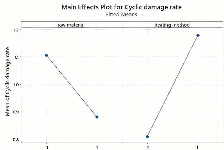 Figure 11: Effect of the main factors and factor interaction on the cyclic damage rate