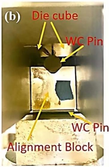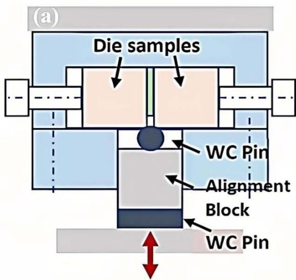 We designed and fabricated a trimming simulator, as shown in Figure 2, to assess the die life and relative damage evolution of a trim die specimen. The cube-shaped specimen measures $3/4$ on each side, with two cutting edges subjected to a concentrated sinewave load through a WC pin. The applied force is equally carried by two specimens using a self-alignment block, allowing the loading train to pass through the edge center. The higher force applied accelerates the edge damage, enabling a quick assessment and comparison of the relative die damage evolution and die life, compared to that observed in real sheet metal trimming processes. The similarity and difference of the loading conditions between this test and real sheet metal trimming process are explained in detail in another paper published by the present author [34].