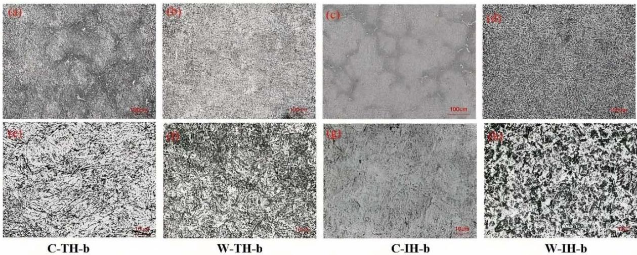 $100\mu \mathrm{m}$ and $10\mu \mathrm{m}$, respectively; C-TH-b: (a) & (e), W-TH-b: (b) & (f), C-IH-b: (c) & (g), W-IH-b: (d) & (h)