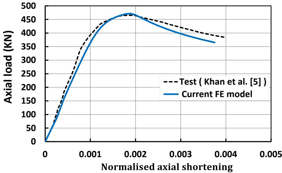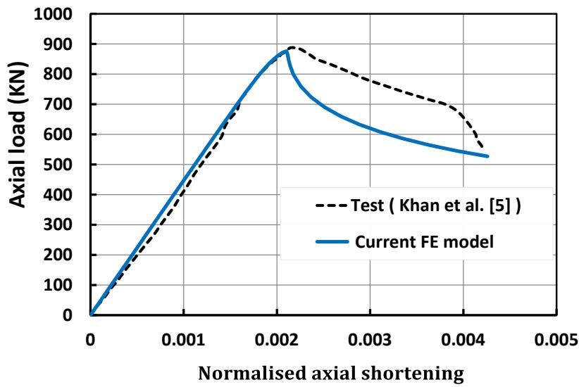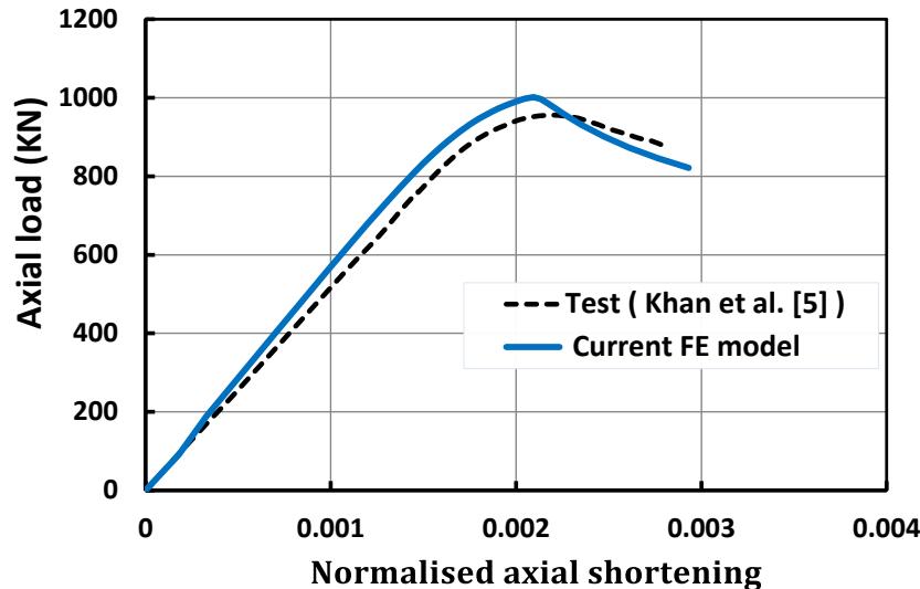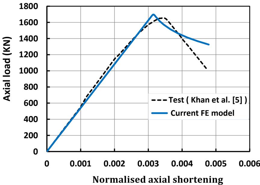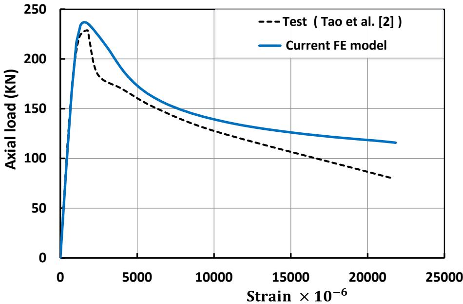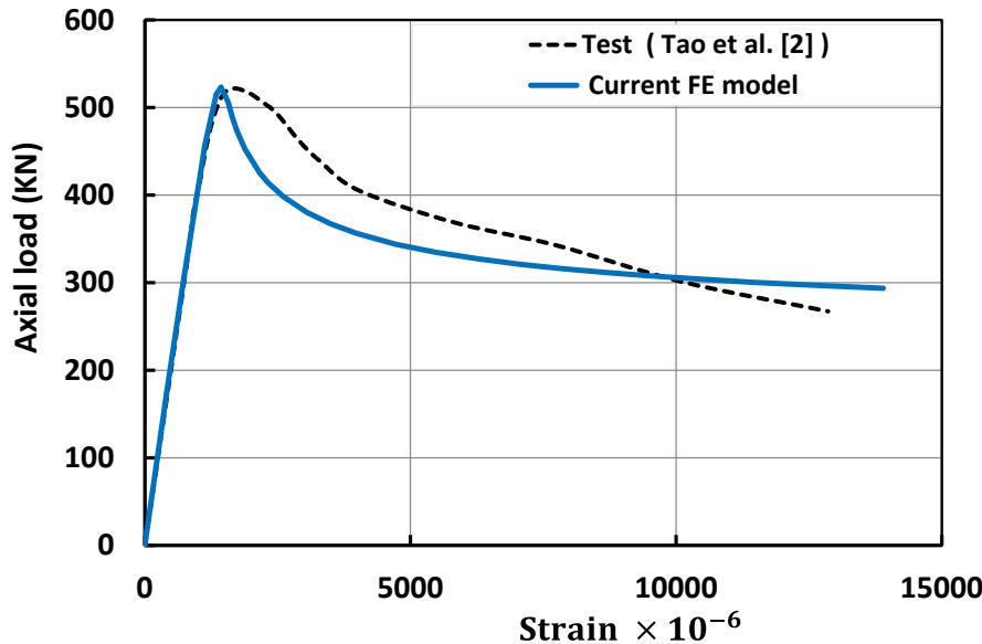 The FE model's accuracy in the present parametric study was verified using previous experimental test results. The verification study, was carried out on, two short square columns that were tested by Tao et al. [2] and four long columns that were tested by Khan et al. [5].