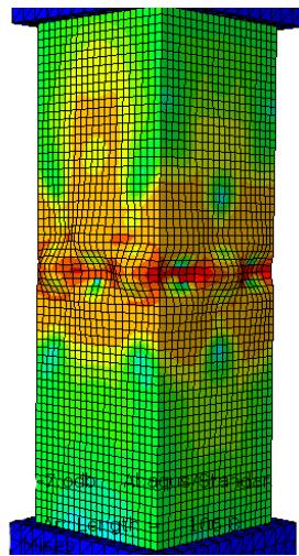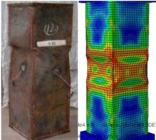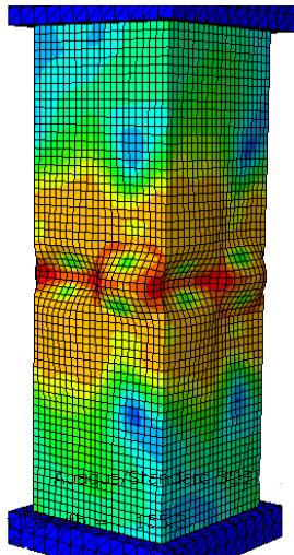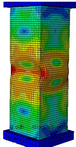 The comparison of the experimental test results and the finite element results for the US25 and SS25 specimens are shown in Figure 7 and Figure 8, respectively. The mean values of the ratio between axial load deduced by FE and test $(N_{FEM} / N_{Test})$ are 1.02, and 1.01 for the US25 and SS25 specimens, respectively. From this study, the predictions of ultimate strengths are very close to the test given by Tao et al. [2]. In addition, the mode of failure due to buckling obtained from the geometric nonlinear buckling FE analysis is shown in Figure 9.