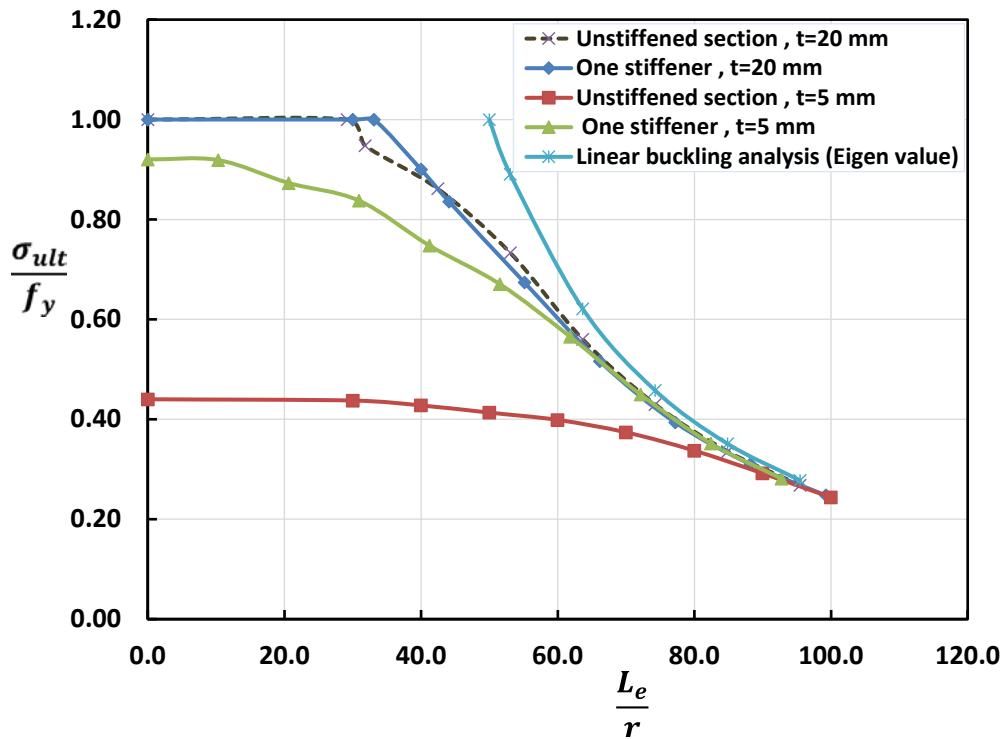 $f_{y} = 1$ this means the columns failed due to the full plastic strength. In addition, when $KL_{e} / r > 29$ the $\sigma_{ult} / f_{y} < 1$ this means the columns failed due to global buckling. The ultimate strength curves for the stiffened and unstiffened sections, when $t = 20\mathrm{mm}$ are very close. In case of the slender sections when $t = 5\mathrm{mm}$ the measured normalized ultimate strength $(\sigma_{ult} / f_{y})$ equal to 0.43 and 0.92 for unstiffened and stiffened short columns, respectively. The ultimate strength curve for stiffened sections higher than unstiffened sections for all $KL_{e} / r$ values as shown in Figure 31. According to this study, the stiffeners greatly affect the ultimate strength of slender sections in the long columns.