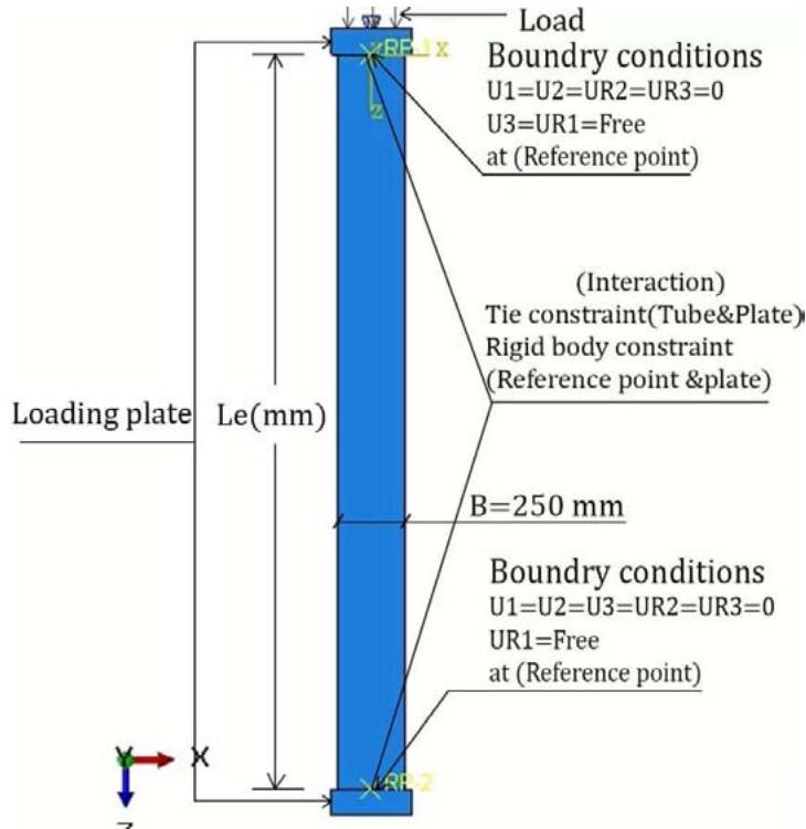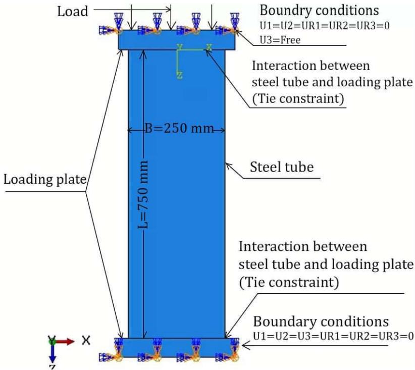 In the case of long columns, two reference points have been created and constrained to the loading plate of all hollow square columns specimens by rigid body constraints and set the boundary condition of the (FE) model at the reference point. Both column ends were modeled as pinned condition, i.e., both ends were free to rotate. While the upper end was unconstrained in the vertical axis to apply the external load. The square steel tube coupled with the loading plate by tie constraint is shown in Figure 6. The axial load was applied in the form of distributed load on the loading plate.