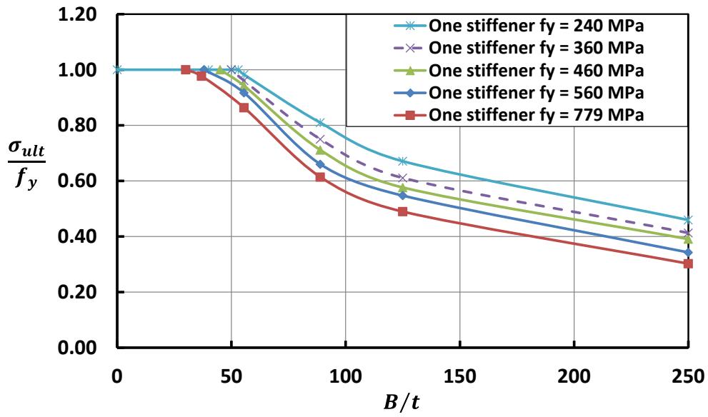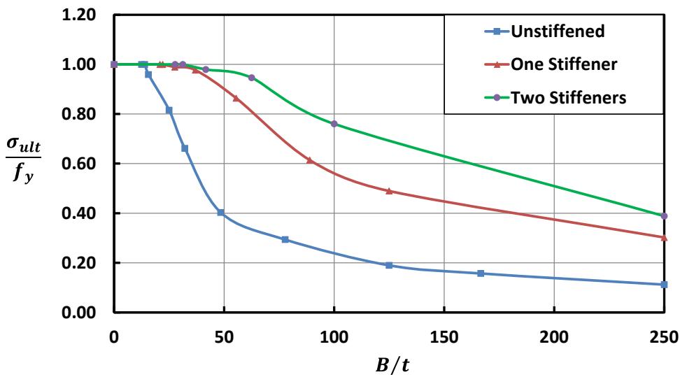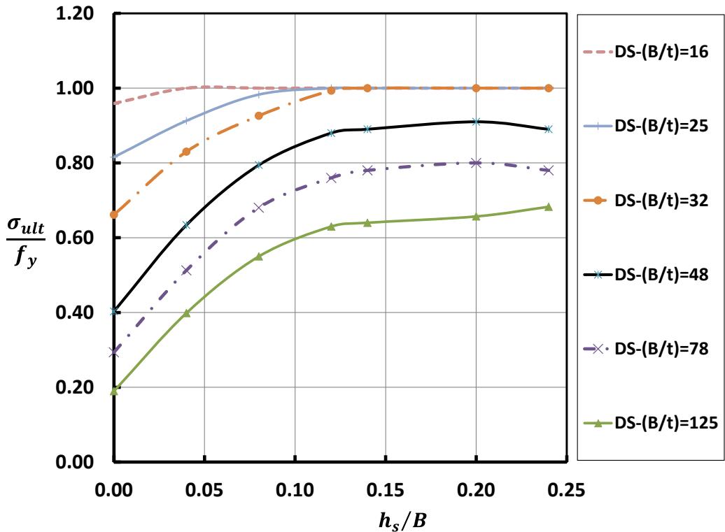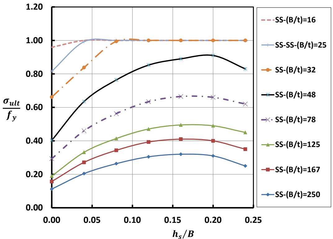 3. When increasing the width-to-thickness ratio $(h_s / t)$ of stiffeners about the optimum stiffener length, the value of $\sigma_{ult} / f_y$ decreases due to local buckling of the stiffener.