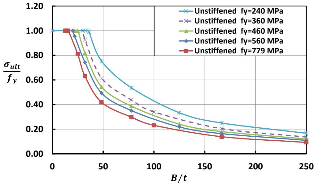 <table><tr><td colspan="3">Unstiffened sections (US)</td><td colspan="3">Stiffened sections with one stiffener (SS)</td><td colspan="3">Stiffened sections with two stiffeners (DS)</td></tr><tr><td>t mm</td><td>fy MPa</td><td>B t</td><td>t mm</td><td>fy MPa</td><td>(B/t)</td><td>t mm</td><td>fy MPa</td><td>(B/t)</td></tr><tr><td>1</td><td>240</td><td>250</td><td>1</td><td>240</td><td>250</td><td>1</td><td>240</td><td>250</td></tr><tr><td>1.5</td><td>240</td><td>167</td><td>2</td><td>240</td><td>125</td><td>2.5</td><td>240</td><td>100</td></tr><tr><td>2</td><td>240</td><td>125</td><td>2.8</td><td>240</td><td>89</td><td>4</td><td>240</td><td>63</td></tr><tr><td>3.2</td><td>240</td><td>78</td><td>4.5</td><td>240</td><td>55</td><td>6</td><td>240</td><td>42</td></tr><tr><td>5.1</td><td>240</td><td>48</td><td>6.7</td><td>240</td><td>37</td><td>8</td><td>240</td><td>31</td></tr><tr><td>7.7</td><td>240</td><td>32</td><td>9</td><td>240</td><td>28</td><td>1</td><td>360</td><td>250</td></tr><tr><td>10</td><td>240</td><td>25</td><td>1</td><td>360</td><td>250</td><td>2.5</td><td>360</td><td>100</td></tr><tr><td>16</td><td>240</td><td>16</td><td>2</td><td>360</td><td>125</td><td>4</td><td>360</td><td>63</td></tr><tr><td>1</td><td>360</td><td>250</td><td>2.8</td><td>360</td><td>89</td><td>6</td><td>360</td><td>42</td></tr><tr><td>1.5</td><td>360</td><td>167</td><td>4.5</td><td>360</td><td>55</td><td>8</td><td>360</td><td>31</td></tr><tr><td>2</td><td>360</td><td>125</td><td>6.7</td><td>360</td><td>37</td><td>1</td><td>460</td><td>250</td></tr><tr><td>3.2</td><td>360</td><td>78</td><td>9</td><td>360</td><td>28</td><td>2.5</td><td>460</td><td>100</td></tr><tr><td>5.1</td><td>360</td><td>48</td><td>1</td><td>460</td><td>250</td><td>4</td><td>460</td><td>63</td></tr><tr><td>7.7</td><td>360</td><td>32</td><td>2</td><td>460</td><td>125</td><td>6</td><td>460</td><td>42</td></tr><tr><td>10</td><td>360</td><td>25</td><td>2.8</td><td>460</td><td>89</td><td>8</td><td>460</td><td>31</td></tr><tr><td>16</td><td>360</td><td>16</td><td>4.5</td><td>460</td><td>55</td><td>1</td><td>560</td><td>250</td></tr><tr><td>1</td><td>460</td><td>250</td><td>6.7</td><td>460</td><td>37</td><td>2.5</td><td>560</td><td>100</td></tr><tr><td>1.5</td><td>460</td><td>167</td><td>9</td><td>460</td><td>28</td><td>4</td><td>560</td><td>63</td></tr><tr><td>2</td><td>460</td><td>125</td><td>1</td><td>560</td><td>250</td><td>6</td><td>560</td><td>42</td></tr><tr><td>3.2</td><td>460</td><td>78</td><td>2</td><td>560</td><td>125</td><td>8</td><td>560</td><td>31</td></tr><tr><td>5.1</td><td>460</td><td>48</td><td>2.8</td><td>560</td><td>89</td><td>1</td><td>779</td><td>250</td></tr><tr><td>7.7</td><td>460</td><td>32</td><td>4.5</td><td>560</td><td>55</td><td>2.5</td><td>779</td><td>100</td></tr><tr><td>10</td><td>460</td><td>25</td><td>6.7</td><td>560</td><td>37</td><td>4</td><td>779</td><td>63</td></tr><tr><td>16</td><td>460</td><td>16</td><td>9</td><td>560</td><td>28</td><td>6</td><td>779</td><td>42</td></tr><tr><td>1</td><td>560</td><td>250</td><td>1</td><td>779</td><td>250</td><td>8</td><td>779</td><td>31</td></tr><tr><td>1.5</td><td>560</td><td>167</td><td>2</td><td>779</td><td>125</td><td>-</td><td>-</td><td>-</td></tr><tr><td>2</td><td>560</td><td>125</td><td>2.8</td><td>779</td><td>89</td><td>-</td><td>-</td><td>-</td></tr><tr><td>3.2</td><td>560</td><td>78</td><td>4.5</td><td>779</td><td>55</td><td>-</td><td>-</td><td>-</td></tr><tr><td>5.1</td><td>560</td><td>48</td><td>6.7</td><td>779</td><td>37</td><td>-</td><td>-</td><td>-</td></tr><tr><td>7.7</td><td>560</td><td>32</td><td>9</td><td>779</td><td>28</td><td>-</td><td>-</td><td>-</td></tr><tr><td>10</td><td>560</td><td>25</td><td>11.3</td><td>779</td><td>22.1</td><td>-</td><td>-</td><td>-</td></tr><tr><td>16</td><td>560</td><td>16</td><td>12</td><td>779</td><td>20.8</td><td>-</td><td>-</td><td>-</td></tr><tr><td colspan="9">Unstiffened sections (US)</td></tr><tr><td>1</td><td>779</td><td>250</td><td>7.7</td><td>779</td><td>32</td><td>1</td><td>779</td><td>250</td></tr><tr><td>1.5</td><td>779</td><td>167</td><td>10</td><td>779</td><td>25</td><td>1.5</td><td>779</td><td>167</td></tr><tr><td>2</td><td>779</td><td>125</td><td>16</td><td>779</td><td>16</td><td>2</td><td>779</td><td>125</td></tr><tr><td>3.2</td><td>779</td><td>78</td><td>18</td><td>779</td><td>13.8</td><td>3.2</td><td>779</td><td>78</td></tr><tr><td>5.1</td><td>779</td><td>48</td><td>20</td><td>779</td><td>12.5</td><td>5.1</td><td>779</td><td>48</td></tr><tr><td colspan="2">Stiffened sections with one stiffener (SS)</td><td colspan="2">Stiffened sections with one stiffener (SS)</td><td colspan="2">Stiffened sections with two stiffeners (DS)</td><td colspan="2">Stiffened sections with two stiffeners (DS)</td></tr><tr><td>t mm</td><td>hs mm</td><td>t mm</td><td>hs mm</td><td>t mm</td><td>hs mm</td><td>t mm</td><td>hs mm</td></tr><tr><td>1</td><td>10</td><td>1</td><td>40</td><td>2</td><td>10</td><td>2</td><td>50</td></tr><tr><td>1.5</td><td>10</td><td>1.5</td><td>40</td><td>3.2</td><td>10</td><td>3.2</td><td>50</td></tr><tr><td>2</td><td>10</td><td>2</td><td>40</td><td>5.1</td><td>10</td><td>5.1</td><td>50</td></tr><tr><td>3.2</td><td>10</td><td>3.2</td><td>40</td><td>7.7</td><td>10</td><td>7.7</td><td>50</td></tr><tr><td>5.1</td><td>10</td><td>5.1</td><td>40</td><td>10</td><td>10</td><td>10</td><td>50</td></tr><tr><td>7.7</td><td>10</td><td>7.7</td><td>40</td><td>16</td><td>10</td><td>16</td><td>50</td></tr><tr><td>10</td><td>10</td><td>10</td><td>40</td><td>2</td><td>20</td><td>2</td><td>60</td></tr><tr><td>16</td><td>10</td><td>16</td><td>40</td><td>3.2</td><td>20</td><td>3.2</td><td>60</td></tr><tr><td>1</td><td>20</td><td>1</td><td>50</td><td>5.1</td><td>20</td><td>5.1</td><td>60</td></tr><tr><td>1.5</td><td>20</td><td>1.5</td><td>50</td><td>7.7</td><td>20</td><td>7.7</td><td>60</td></tr><tr><td>2</td><td>20</td><td>2</td><td>50</td><td>10</td><td>20</td><td>10</td><td>60</td></tr><tr><td>3.2</td><td>20</td><td>3.2</td><td>
