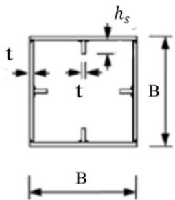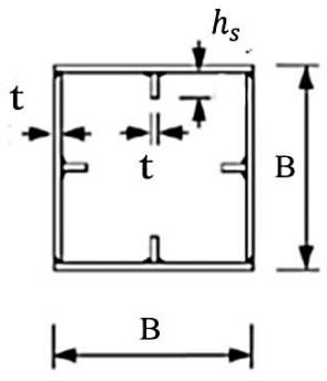 The steel material model for the finite elements was assumed to be an elastic-plastic model as shown in Figure 2, in addition taken as the hardening modulus equal to $0.005E_{s}$. The Young's modulus $E_{s} = 200000\mathrm{MPa}$ and Poisson's ratio $\nu = 0.3$. The studied parameters were the yield strength $f_{y} = 240,360,460,560$, and $779\mathrm{MPa}$, the stiffeners length $(h_s)$, and the ratio $B / t$. The columns length is $L = 750mm$ and the columns width is $B = 250mm$ for all the specimens. The thickness of the stiffeners is considered same as the thickness of the tube, as listed in Tables (3 and 4). The shapes and dimensions of the investigated steel columns are shown in Figure 16. The specimen label shows the whether the sections is unstiffened (US), stiffened using single stiffener per section wall (SS), or stiffened using double stiffener per section wall (DS). In addition, the label suffixed by the thickness of the section walls in (mm).
