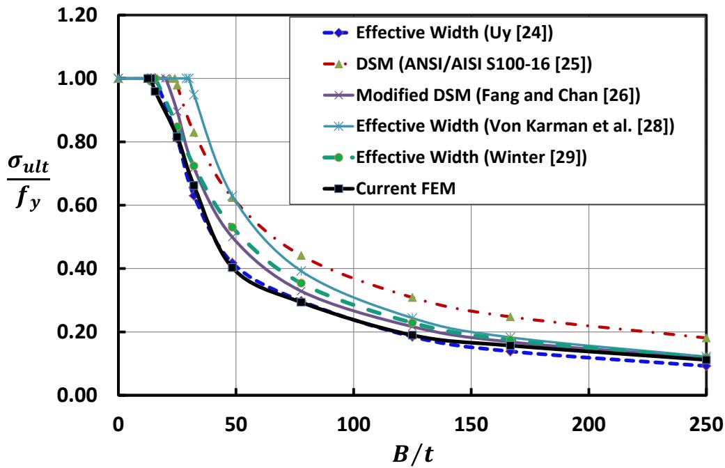 Where the coefficient of plate buckling $(K)$ can be considered as 4 for hollow sections and $N_{s} = (b_{e} / b)A_{s}f_{y}$. Von Karman et al. [28] developed the first effective width expression in 1932. This expression states that a width of plate $(b)$ and effective width $(b_{e})$ can be used to evaluate the ultimate strength capacity. Von Karman's effective width can be written in terms of the yield stress $\sigma_{y}$ and critical stress $\sigma_{CR}$ as follows: