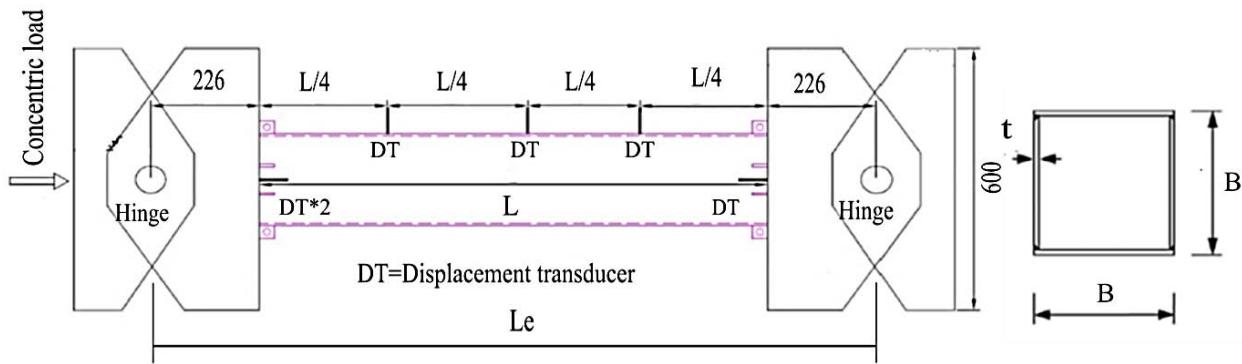 For long columns, the steel material for the finite element models was assumed to be an elastic-plastic model as shown in Figure 2. The yield strength $f_{y} = 762 \, MPa$, The elastic modulus $E_{s} = 213 \, GPa$, The yield strain 0.4157 (\%), and the ultimate strength $F_{ult} = 819 \, MPa$. The verification was performed for slender welded box sections with $L_{e} / r = (77,66,28,$ and 59) and $b_{e} / b = (1.0$ and 0.8). The dimensions of test specimens are shown in Table 2 and the illustration of the experimental test layout is shown in Figure 4.