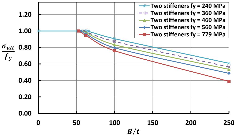 $(\sigma_{\mathrm{ult}} / f_{\mathrm{y}})$ for the stiffened sections with two stiffeners, where $h_s = 35 \, \text{mm}$