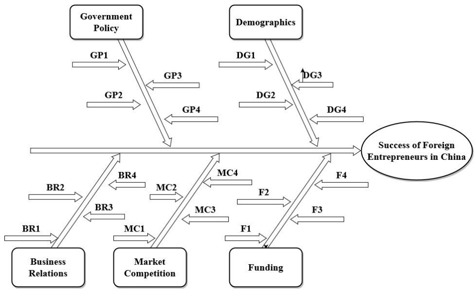 <table><tr><td>Government Policy (GP)</td><td>Demographics (DG)</td><td>Business Relations (BR)</td><td>Market Competition (MC)</td><td>Funding (Fu)</td></tr><tr><td>GP1: Open Door Policy</td><td>DG1: Upcoming middle class</td><td>BR1: Guanxi</td><td>MC1:Domestic Competitors</td><td>Fu1:Venture Capital</td></tr><tr><td>GP2: Forex Policy</td><td>DG2: Language</td><td>BR2: Trust</td><td>MC2: Market Access Restriction</td><td>Fu2: Private Equity</td></tr><tr><td>GP3: Tax Obligations</td><td>DG3: Innovation Management</td><td>BR3: IPR</td><td>MC3: Access to supply networks</td><td>Fu3:Self Organized Entrepreneurs</td></tr><tr><td>GP4: Regulatory Transparency</td><td>DG4: Digitized Society</td><td>BR4: Rising labor costs</td><td>MC4:Human resource and Political connections</td><td>Fu4: Tech- Startups</td></tr></table>