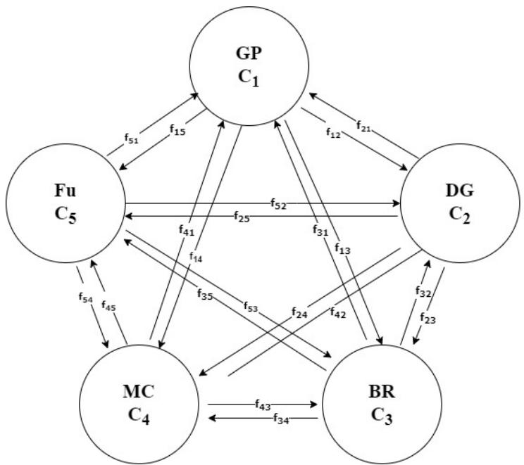 Where CSF is the Critical Success Factors index. $C_i$ stands for the major factors (GP=C1, DG=C2, BR=C3, MC=C4, Fu=C5) found on nodes of the digraphs and $f_{ij}$ is the relative importance of the ith factor as compared to the jth which are shows as edges in the digraph.
