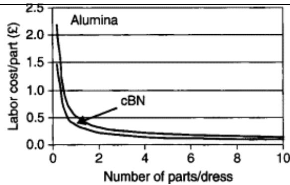 I.T. labour cost/part is affected by the total cycle time. It therefore depends on hardware and software removal rate, run-out time, number of network dressing passes, "dressing feed rate", and by number of