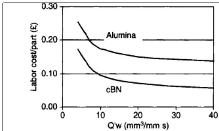 - Alumina: The I.T. labour cost for alumina grinding starts at approximately £0.30/part at a Q'w of 0 mm3/mm·s and decreases to approximately £0.05/part at a Q'w of 40 mm3/mm·s.