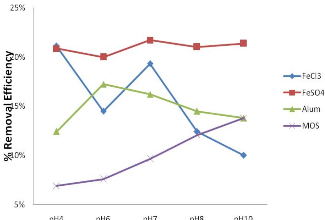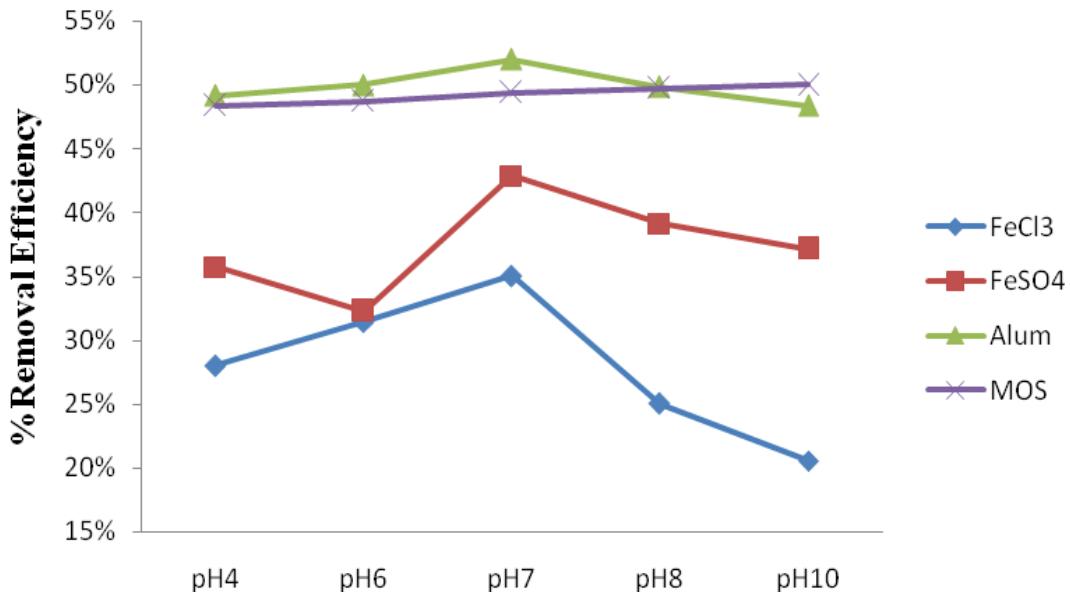 Noticed that all the coagulants gave different results at different pH.$\mathrm{FeCl}_3$and$\mathrm{FeSO}_4$had optimum pH of 7, while Alum had optimum pH of 6, and MOS had its optimum pH at a pH value of 10.