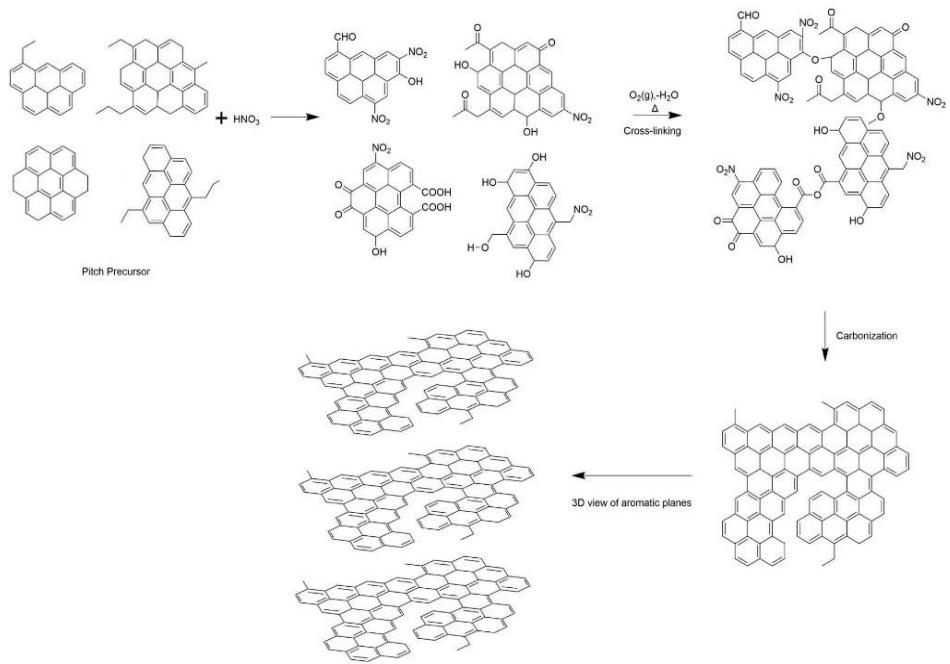 Through treatment with acid reagents—primarily nitric acid, sulfuric acid, or mixed acids—oxygen-containing functional groups such as carboxyl, hydroxyl, and carbonyl are introduced into mesophase pitch molecules. These functional groups increase the polarity and chemical reactivity of the pitch. Controlled cross-linking induces thermosetting behavior in the pitch system, with the raised softening temperature ( $\Delta T \sim 15-25^{\circ}\mathrm{C}$ ) directly correlating with improved spin-line stability during melt extrusion.
