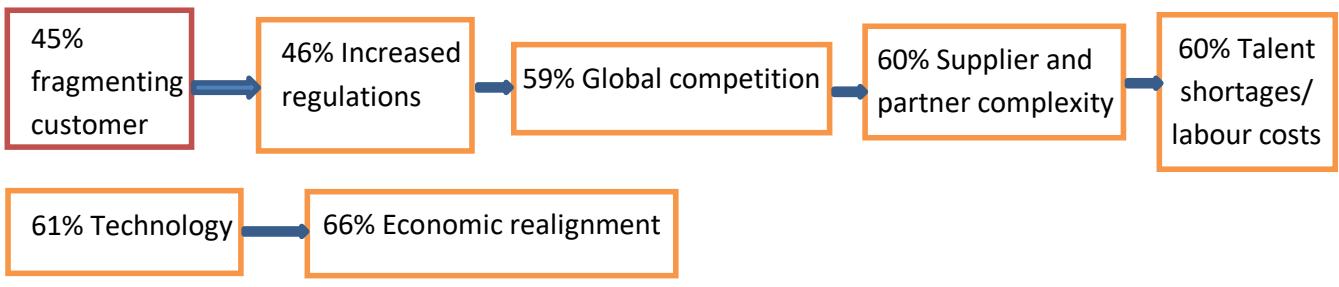 Research indicates that manufacturers should first understand the market trends anticipated to have the most significant effect in the next three years and subsequently align these insights with their ongoing strategy and planning. Economic challenges experienced globally over the previous decade, coupled with emerging technologies, stand out as the two primary elements (reported by $66\%$ and $61\%$ of respondents, respectively) that have prompted a foundational shift in manufacturing competition rather than merely a cyclical one.