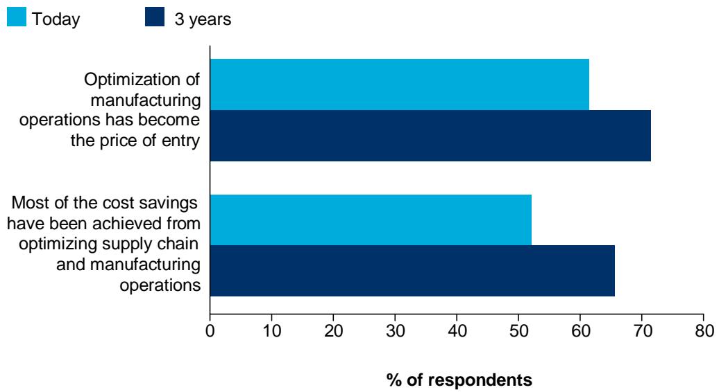 The growing focus on strategy and planning can be attributed to the diminishing effectiveness of traditional methods for enhancing profitability. More than half (52%) of those surveyed stated that they have exhausted almost all potential cost savings in their manufacturing processes. While this statistic suggests that there is still progress to be made, 65% of executives surveyed feel that optimizing operations has shifted from being a differentiator to merely the baseline requirement for the industry. This proportion is expected to increase to 71% within three years.