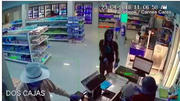 The SSD (Single Shot MultiBox Detector) results demonstrate the efficacy of this approach. With an average precision (AP) of $86.89\%$ for detecting "Person" instances, the model reliably identifies individuals, which is crucial for accurately determining whether someone should be flagged as high risk based on their behavior or the objects they carry. The model also shows strong performance in detecting specific weapons, with APs of $84.85\%$ for "Shotgun" and $91.58\%$ for "Handgun," which enhances the system's ability to identify individuals carrying these dangerous items. Fig. 6(a) and 6(b) show respectively the sample footage used for inference and the result. The footage is a real-life robbing scene captured by CCTV.