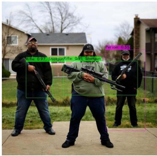 For our result, a confidence threshold of 0.25 was set, this threshold means an object to be detected, must first cross a $25\%$ detection threshold for example for a class "Shotgun" to be said to be in a scene, the model must have seen the class crossed $25\%$ initial detection threshold. This is to ensure that less confidence predictions are filtered out which therefore ensures a reliable detection mechanism.
