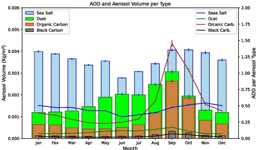 Figure 5: Total volume (bars) and optical thickness (line) for aerosol types. In orange, data refers to organic carbon; in blue, those refer to sea salt; in green, those refer to dust; and in light black, those refer to black carbon. Data are from the MERRA2 reanalysis, with a study period from 2006 to 2019.