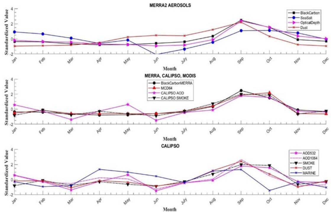 Figure 8: Monthly average standardized anomalies for the period 2006 to 2019, using MERRA-2 data (8a), the comparison between CALIPSO, MERRA, and MODIS data (8b) and CALIPSO data (8c). In Figures 8a and 8c, the colors of the lines represent purple, the aerosol optical thickness data; blue, marine aerosol data; red, dust data; and black, the smoke and/or black carbon data. In Figure 8b, the color black represents the black carbon data from MERRA-2 and the smoke data from the VFM from CALIPSO, the red color represents the burned area data from MCD64, and, in purple, the optical thickness data from the CALIPSO aerosols.