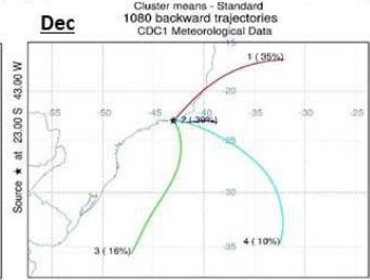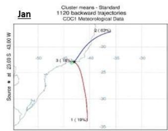 Figure 7: Retrotrajectories clusters of air masses, separated by month (compiled from 2006 to 2019).