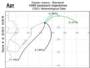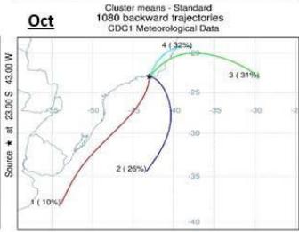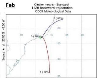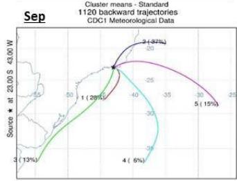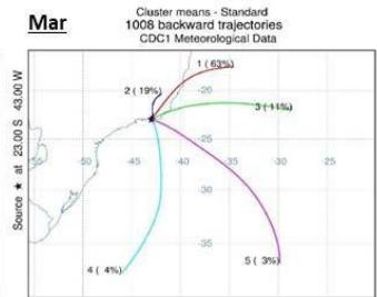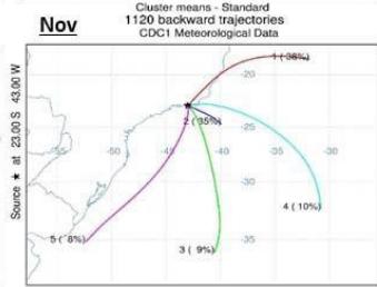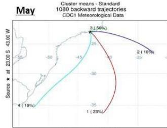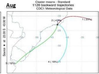 Figure 7 represents the retrotrajectories of the air masses that ended in the study area. Each of the twelve images refers to the total number of simulations performed each month during the sixteen years of the study period. The retrojectives are grouped into clusters that were divided using the elbow method. There is no apparent connection between the direction and direction of the trajectories with the time of year. What can be seen in the simulations is that there is a trend of increasing advection of sea air in the summer months (DJF). This result was expected since, in the summer months, as previously mentioned, there is a more significant influence of the winds coming from the ASAS. As a result, the atmospheric circulation related to the anticyclone is northeast, mainly wind in the study area, which results in greater advection and, consequently, a greater concentration of sea salt (marine aerosols) during these months.