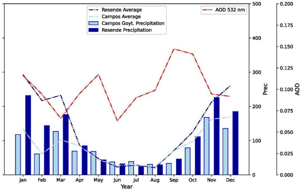 Figure 2: Average monthly totals of Aerosol Optical Depth from the CALIPSO satellite, with a study period from 2006 to 2019, are represented in red. Light (dark) blue bars indicate precipitation values from INMET's normals for the cities of Campos dos Goytacazes (Resende). The blue lines represent the average precipitation over the period between 2006 and 2019.