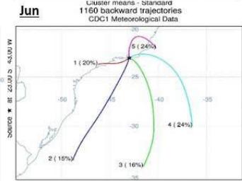 To identify the origin of the air masses over the MARJ, the Hybrid Single-Particle Lagrangian Integrated Trajectory Model (HYSPLIT) model that simulates the trajectories and retro trajectories of particles suspended in the atmosphere was used. HYSPLIT is a model used to investigate particle dispersion [15]. It can be used in several applications, such as in the study of radionuclide dispersion [16], pyrogenic particle dispersion [17], pollen transport [18], the transport of volcanic ash [19], the transport of pollution [5] and the transport of dust between continents [20]. This work used a global grid with $1^{\circ}$ horizontal resolution, with meteorological data from the National Center for Environmental Prediction (NCEP) Global Data Assimilation System.