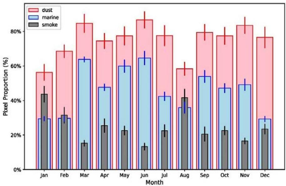 The results show that the pixels classified as dust are the most common after the marine aerosols, reaching total values above the marine during Jan (39.7%), Feb (48.2%), Jul (44.4%), and Dec (54.1%) months. They represent all types of mineral particles originating from the erosion processes of rocks and soil, which are suspended in the atmosphere. Pixels classified as marine aerosols represent a large part of the classifications, exceeding 40 percent in 7 of the 12 months of the year, and smoke is more important during Aug (34.7%).