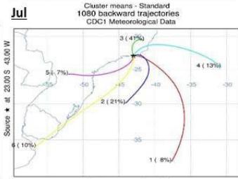 Similarly, practically half of the simulations had continental coordinates as their starting point in June and July. This result is consistent, considering that the frequency of cold fronts increases in winter. Additionally, the westward shift of the ASAS center extends further into the continent during the summer months [24]. With this configuration of the ASAS, the incursion of the northeast winds in the study area decreases, as indicated in Figures 6 and 7. Consequently diminishing the trajectories that characterize air masses originating from the sea. Thus, there is evidence that the optical thickness peaks that occur in winter are linked to local sources of aerosols.