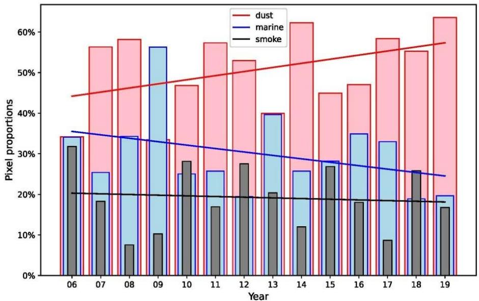 From the CALIOP sensor data, the trend in the proportion of these aerosols during the study period was also estimated. Figure 4 shows that the proportion of dust aerosols has been increasing significantly over this period compared to the presence of marine aerosols and smoke. These results align with the findings in [26], which demonstrated that this region has been experiencing increased aridity throughout nearly all months of the year, leading to a concurrent rise in diffuse solar radiation, particularly during the dry season.