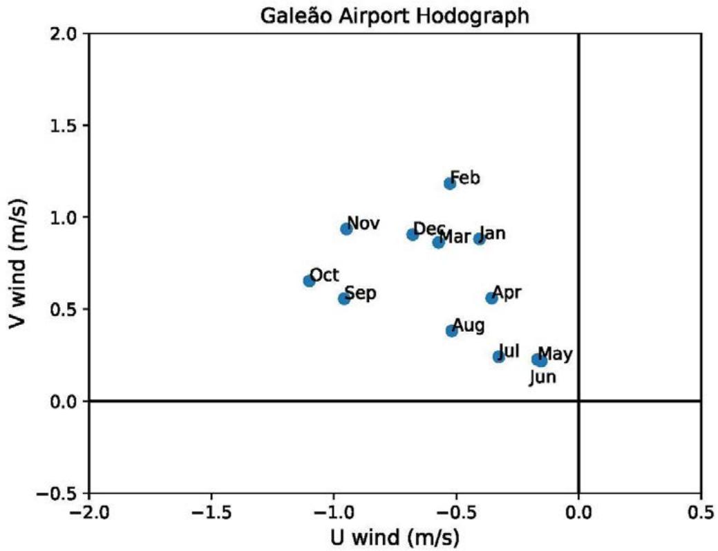 The seasonality of marine aerosols in the atmosphere is linked to the incursion of sea winds in the study area, as can be seen in Figure 6, which represents the hodography generated from METAR message data from Tom Jobim International Airport in the city of Rio de Janeiro.