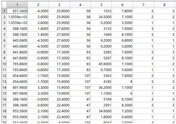 <table><tr><td></td><td>A</td><td>B</td><td>C</td><td>D</td><td>E</td><td>F</td><td>G</td></tr><tr><td>1</td><td>02:05:46.10</td><td>2.4</td><td>6.1</td><td>341</td><td>3837</td><td>11.2</td><td>7.4</td></tr><tr><td>2</td><td>02:05:46.10</td><td>2.4</td><td>6.1</td><td>341</td><td>3837</td><td>11.2</td><td>7.4</td></tr><tr><td>3</td><td>02:05:46.10</td><td>2.4</td><td>6.1</td><td>341</td><td>2971</td><td>13.5</td><td></td></tr><tr><td>4</td><td>02:05:46.10</td><td>2.4</td><td>6.1</td><td>341</td><td>2504</td><td>7.2</td><td>7.4</td></tr><tr><td>5</td><td>02:05:46.10</td><td>2.4</td><td>6.1</td><td>341</td><td>25</td><td>1.4</td><td></td></tr><tr><td>6</td><td>02:05:46.10</td><td>2.4</td><td>6.1</td><td>341</td><td>22.3</td><td>1.6</td><td>6.4</td></tr><tr><td>7</td><td>02:07:30.00</td><td>4.3</td><td>6.1</td><td>341</td><td>22.3</td><td>1.6</td><td></td></tr><tr><td>8</td><td>02:06:06.00</td><td>4.3</td><td>6.1</td><td>341</td><td>22.3</td><td>1.6</td><td></td></tr><tr><td>9</td><td>02:06:06.00</td><td>4.3</td><td>15.1</td><td>56</td><td>8641</td><td>20.9</td><td>8</td></tr><tr><td>10</td><td>02:06:06.00</td><td>4.3</td><td>15.1</td><td>56</td><td>4891</td><td>19.6</td><td></td></tr><tr><td>11</td><td>02:06:06.00</td><td>4.3</td><td>15.1</td><td>56</td><td>3048</td><td>19.1</td><td>7.9</td></tr><tr><td>12</td><td>02:10:57.80</td><td>4.7</td><td>15.1</td><td>56</td><td>3048</td><td>19.1</td><td></td></tr><tr><td>13</td><td>02:10:46.40</td><td>0.6</td><td>15.1</td><td>56</td><td>3048</td><td>19.1</td><td></td></tr><tr><td>14</td><td>02:10:39.30</td><td>3.5</td><td>15.1</td><td>56</td><td>3048</td><td>19.1</td><td></td></tr><tr><td>15</td><td>02:07:53.60</td><td>-0.5</td><td>15.1</td><td>56</td><td>3048</td><td>19.1</td><td></td></tr><tr><td>16</td><td>02:07:46.60</td><td>-1.9</td><td>15.1</td><td>56</td><td>3048</td><td>19.1</td><td></td></tr><tr><td>17</td><td>02:07:46.60</td><td>-1.9</td><td>16.4</td><td>294</td><td>4294</td><td>17.1</td><td>7.8</td></tr><tr><td>18</td><td>02:07:46.60</td><td>-1.9</td><td>16.4</td><td>294</td><td>3972</td><td>15.8</td><td></td></tr><tr><td>19</td><td>02:07:46.60</td><td>-1.9</td><td>16.4</td><td>294</td><td>1781</td><td>17.1</td><td>7.9</td></tr><tr><td>20</td><td>02:11:11.50</td><td>5.2</td><td>16.4</td><td>294</td><td>1781</td><td>17.1</td><td></td></tr></table>