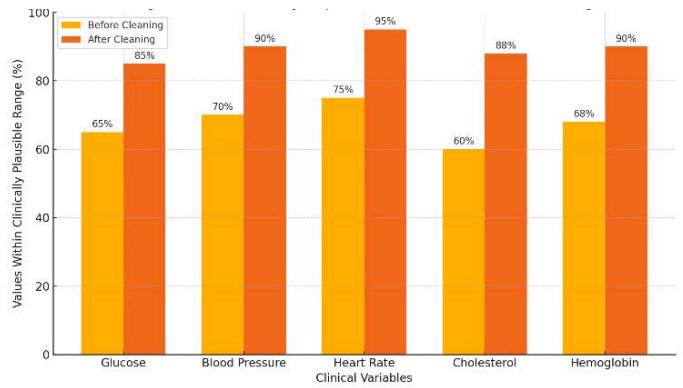 - Data Cleaning Quality: On an EHR dataset of 1 million records (with injected errors and missing values), the AI-driven cleaning device reduced missing data by $20\%$ compared to a rule-only pipeline and increased the proportion of values within clinically plausible ranges. For example, numeric lab values fell within normal ranges of $80\%$ after cleaning vs $60\%$ before (Figure8). These results align with those of Shi et al., who reported marked improvements in completeness and correctness after automated cleaning. The cleaning device processed the dataset in 5 minutes, whereas the traditional ETL approach required $\sim 15$ minutes on the same hardware. This $3\times$ speedup is due to parallel ML-driven processing and optimized code paths.