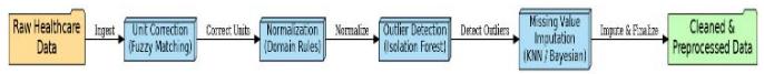 The data Cleaning & Preprocessing Device utilizes AI algorithms inside a modular computing system that collects raw healthcare data and delivers standardized, high-quality datasets. The device structure contains three primary elements, which include (a) connectivity adapters for different data sources like EHR databases and sensor streams and lab systems, (b) a knowledge-driven rule engine, and (c) anomaly-detection and imputation machine learning frameworks [5]. A pipeline process cleans data from entry to exit, during which it undergoes syntactic format checking followed by semantic normalization through unit conversion, outlier detection, and missing data estimation. The representative data flow appears in Figure 2 below.