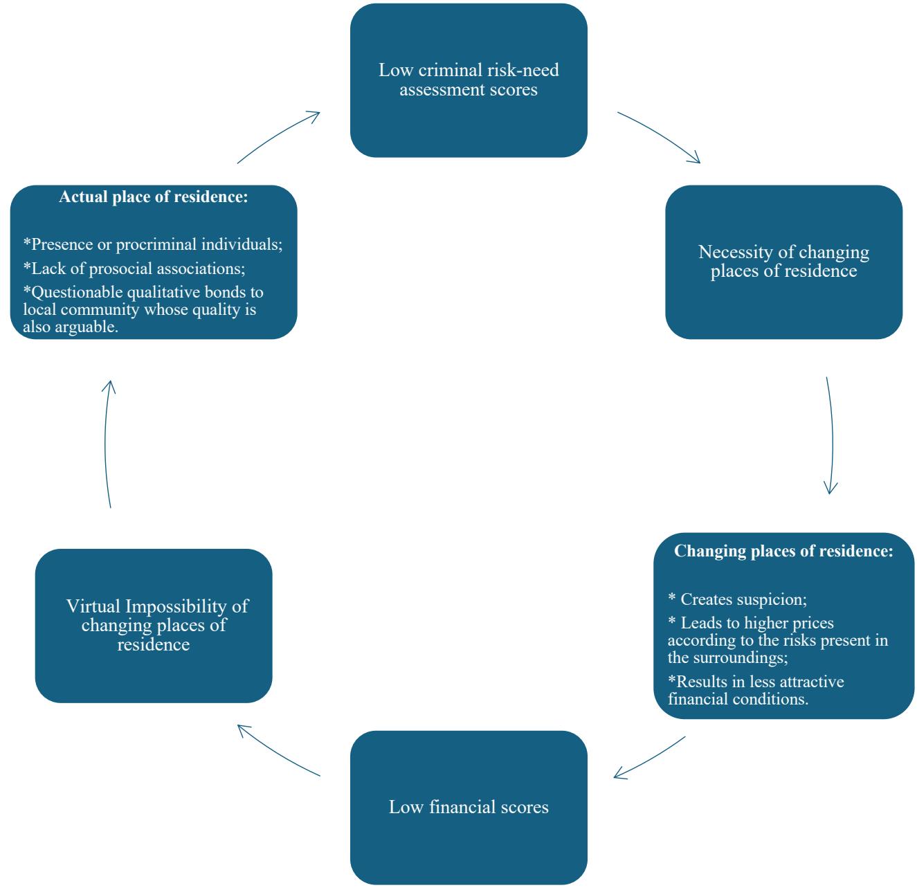 By analyzing whether the place of residence plays a relevant role in scoring individuals both criminally and financially, the aim is not to reach a deterministic conclusion that would establish the place of residence as a necessary, let alone sufficient, condition for poor scoring—judicially or financially. Criminal theories and their scholars have pursued this approach for decades, and the literature has shown that a causal connection between poverty and crime does not exist. Specifically, poverty, lack of opportunities, identification with subcultures, and access to mechanisms of social and financial rewards appear relevant but are not sufficient when considered in isolation, in line with Bonta and Andrews (2024) and their summarized analysis of criminological theories.