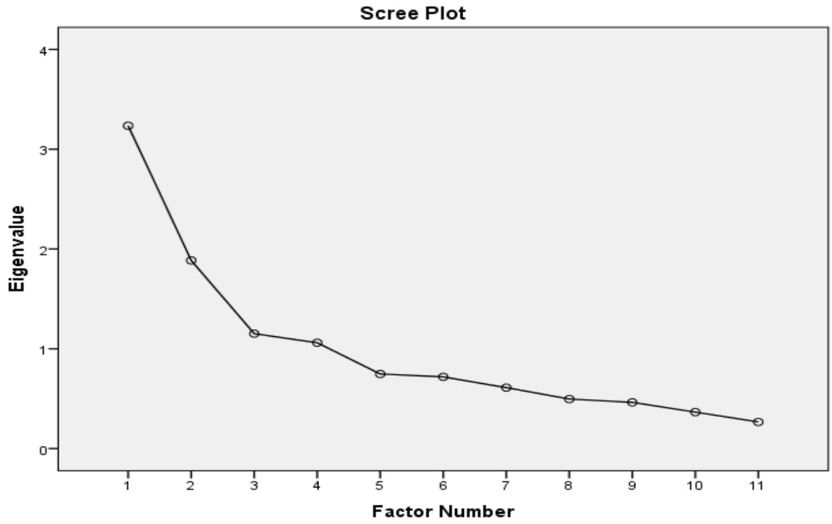 <table><tr><td rowspan="2">Factor</td><td colspan="3">Initial Eigen values</td><td colspan="3">Extraction Sums of Squared Loadings</td><td>Rotation Sums of Squared Loadingsa</td></tr><tr><td>Total</td><td>% of Variance</td><td>Cumulative%</td><td>Total</td><td>% of Variance</td><td>Cumulative%</td><td>Total</td></tr><tr><td>1</td><td>3.235</td><td>29.411</td><td>29.411</td><td>2.781</td><td>25.280</td><td>25.280</td><td>2.521</td></tr><tr><td>2</td><td>1.885</td><td>17.140</td><td>46.551</td><td>1.317</td><td>11.972</td><td>37.252</td><td>1.447</td></tr><tr><td>3</td><td>1.152</td><td>10.468</td><td>57.020</td><td>.753</td><td>6.849</td><td>44.101</td><td>1.096</td></tr><tr><td>4</td><td>1.061</td><td>9.643</td><td>66.663</td><td>.592</td><td>5.383</td><td>49.484</td><td>.943</td></tr><tr><td>5</td><td>.747</td><td>6.792</td><td>73.455</td><td></td><td></td><td></td><td></td></tr><tr><td>6</td><td>.719</td><td>6.532</td><td>79.987</td><td></td><td></td><td></td><td></td></tr><tr><td>7</td><td>.611</td><td>5.551</td><td>85.538</td><td></td><td></td><td></td><td></td></tr><tr><td>8</td><td>.496</td><td>4.510</td><td>90.048</td><td></td><td></td><td></td><td></td></tr><tr><td>9</td><td>.463</td><td>4.211</td><td>94.259</td><td></td><td></td><td></td><td></td></tr><tr><td>10</td><td>.365</td><td>3.320</td><td>97.579</td><td></td><td></td><td></td><td></td></tr><tr><td>11</td><td>.266</td><td>2.421</td><td>100.000</td><td></td><td></td><td></td><td></td></tr></table>