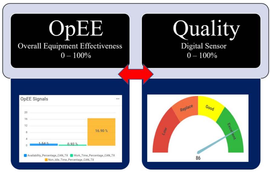 The implication of this study would be to suggest that a variety of quality sensors across industries could be used to increase reliability and overall machine productivity at an economical cost (because manufacturers cannot afford to put sensors on everything). Demonstrating the utility of this technology could greatly influence the adoption of cost-effective sensors and IoT to significantly improve fleet performance and profitability. Demonstrating that more than one type of quality indicator can be used with the OpEE® score could have tremendous impact on industries using machines and equipment.
