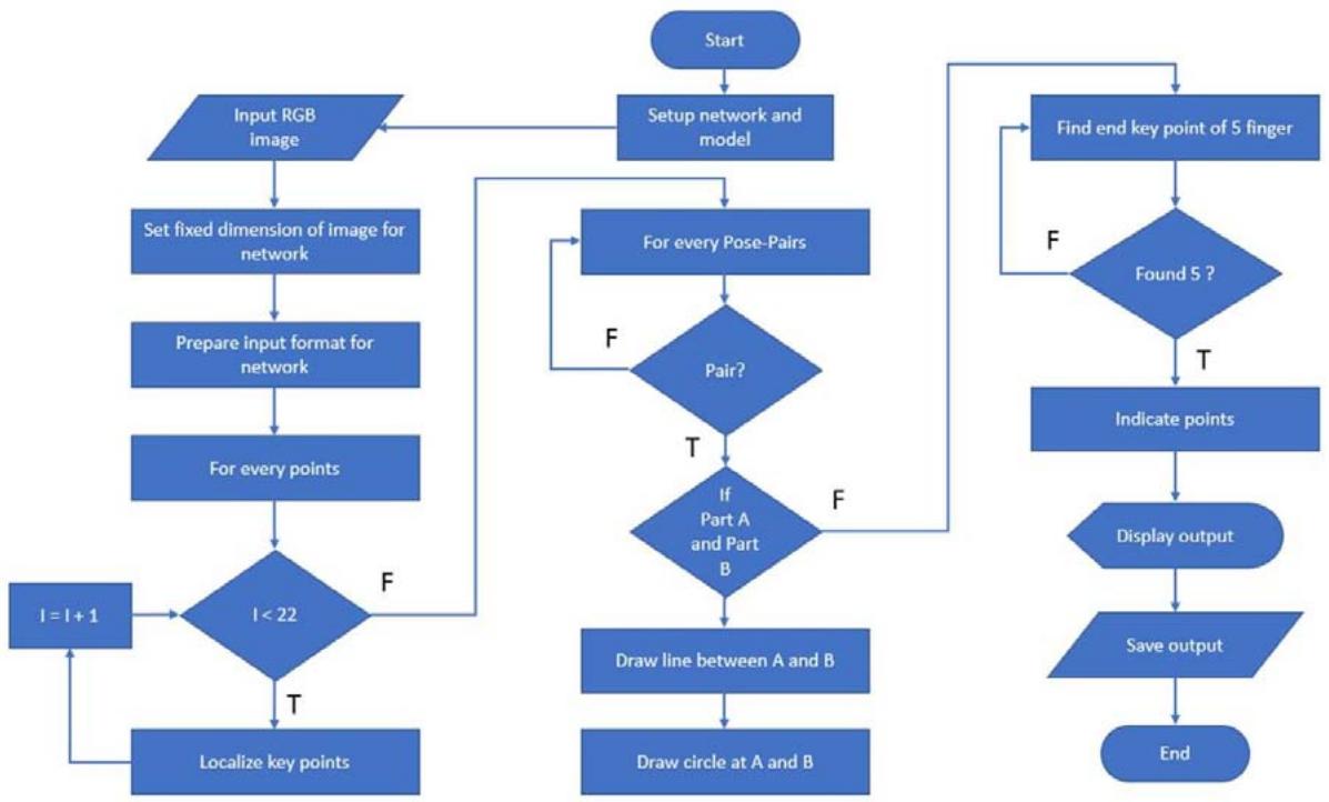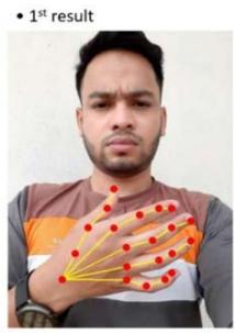 We configured our network module and dataset using OpenCV, along with prototext and caffeomodel files. Subsequently, we processed an RGB image containing a hand. The process of detecting keypoints resembles identifying notable points on the hand, akin to human hand joints. We established 22 points to pinpoint hand keypoints and established pairs of keypoints to connect specific points, akin to a human skeleton. Once this method localizes all the keypoints, we depict the skeleton by drawing lines between the pairs and represent the keypoints as circles. Ultimately, we present the output, showcasing the detected keypoints and skeleton.