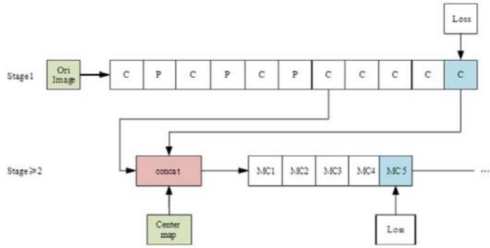 The overall structure of the CPMs is depicted in Figure 2, where "C" and "MC1, MC2" denote different convolution layers, and "P" represents various pooling layers. The "Centre map" denotes the central point of the human body image, used for aggregating response maps to the image centers. The "Loss" function reflects the minimum output cost, consistent with subsequent figures.