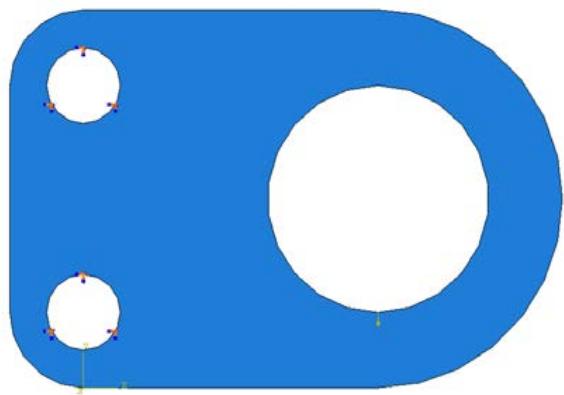 A two-dimensional plane stress problem is shown in Figure6. In this problem, the objective is to fabricate a basic bracket section using a steel plate with a thickness of 20 mm. The plate is fixed at the two smaller holes on the left and subjected to a load applied at the larger hole on the right.